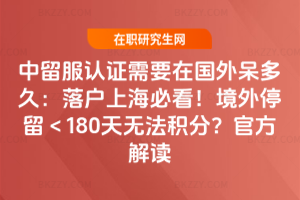 中留服認證對境外停留時間要求依學制和學習模式而異。全日制本科及以上學歷,境外實際停留不少于總學制60%;中外合作辦學等境外學習階段不少于6個月。落戶上海積分要求與之一致,本科滿2年、碩士滿1年、博士滿360天,因疫情等特殊情況可憑院校線上學習證明正常積分。……